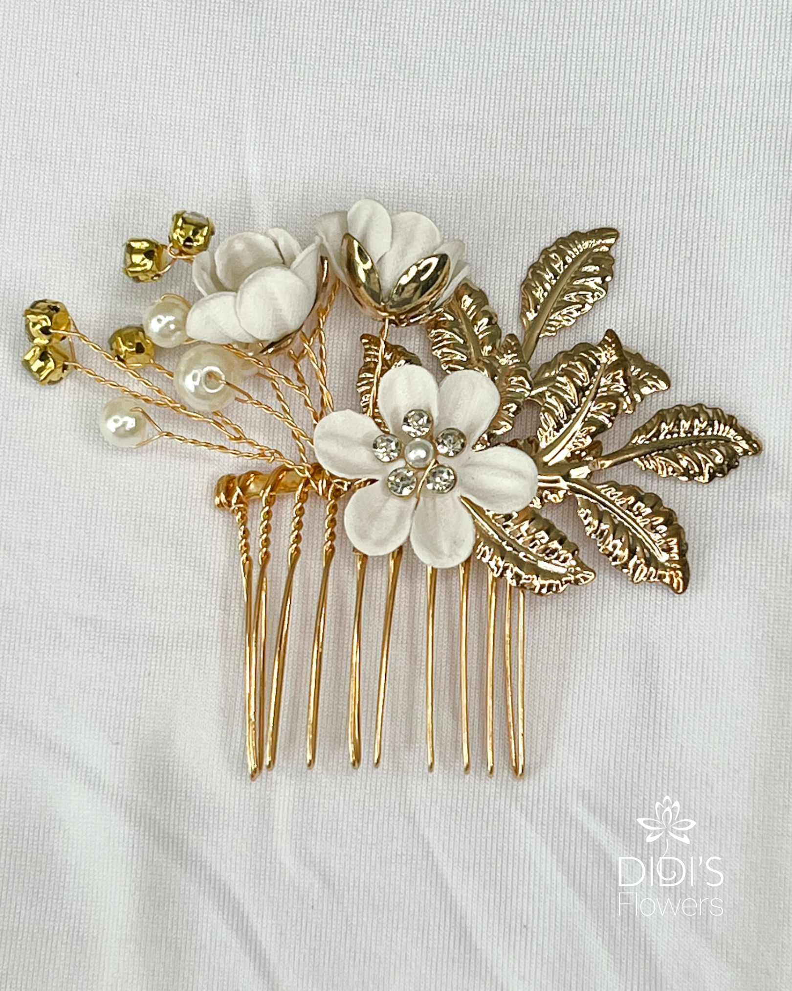 A delicate white flower hair comb, perfect for brides or bridesmaids. Adds a romantic, timeless touch to any wedding hairstyle.